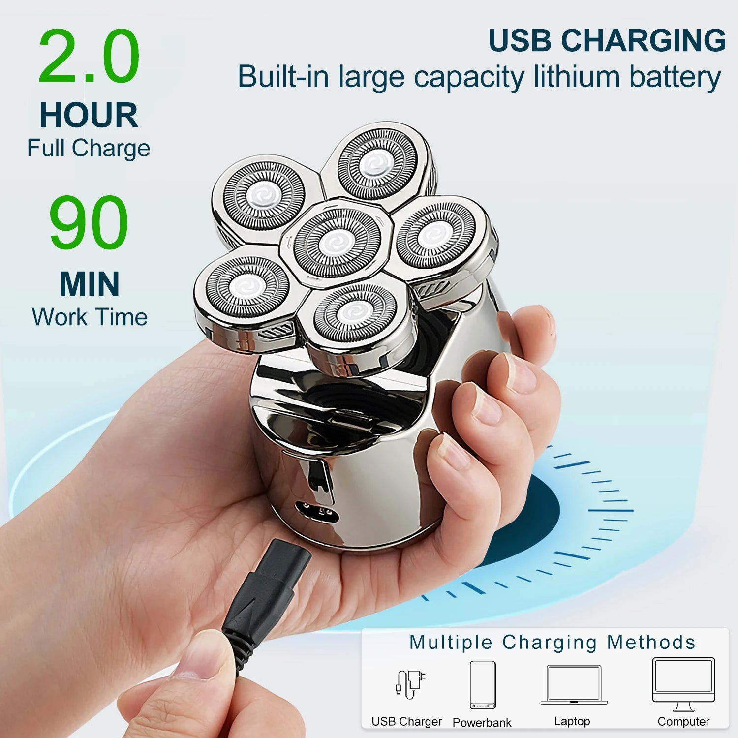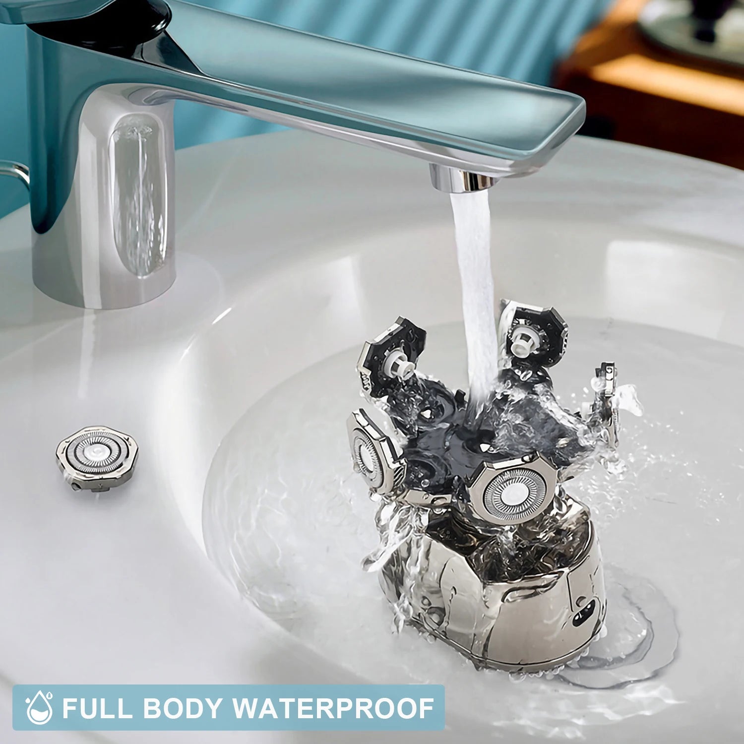 - Six floating heads adapt to your facial contours, with stainless steel blades delivering a precise, comfortable shave across cheeks, jawline, and neck.